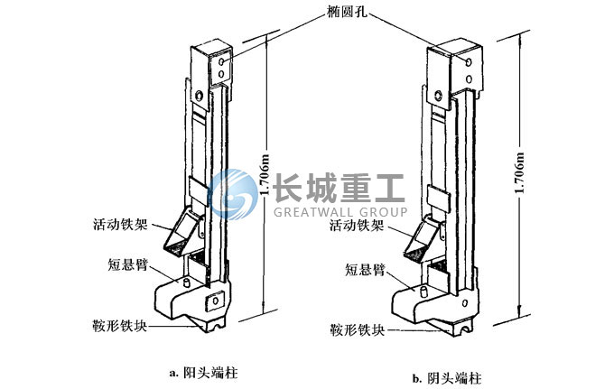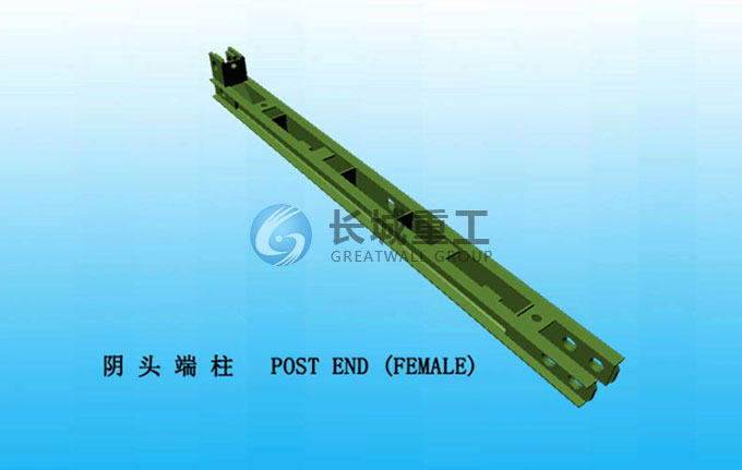 端柱安置在桥梁的两端。用于将桥梁上的荷载传递到桥梁支座上。端柱有阳头和阴头两种。安装时,阴头端柱装在桁架的阳头上,阳头端柱装在桁架的阴头上。端柱侧面的两个圆孔连接于桁架的上、下弦杆,上面的一个椭圆孔与第二层桁架连接;端柱下部设有带定位销的短悬臂和活动铁扣,用于设置和固定横梁。