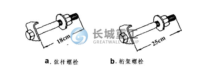 弦杆螺栓 M36 X 180,形状与桁架螺栓相同,仅长度短7厘米。用于连接桁架与加强弦杆,安装时按下图所示,使螺杆头部埋在加强弦杆内,以免桥梁推出时受阻。