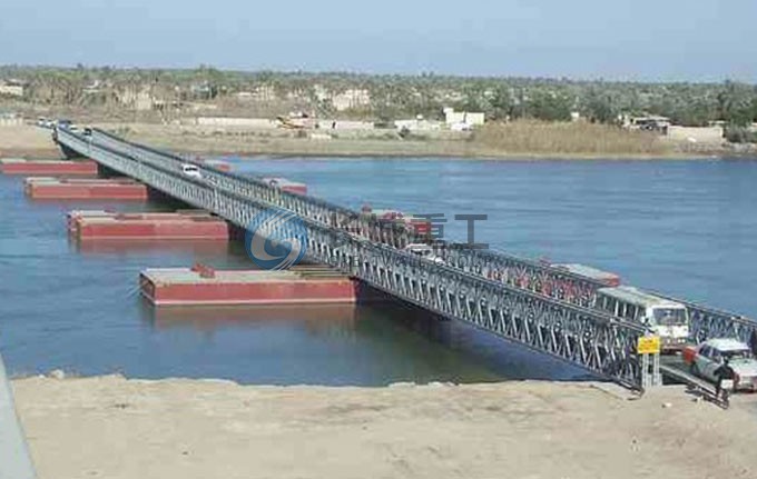 贝雷浮桥顾名思义,上部结构为装配式公路钢桥的浮桥,综合提升了浮桥拆装方便,架设快速的特点。广泛运用在抗震救灾军事物资的运输上。